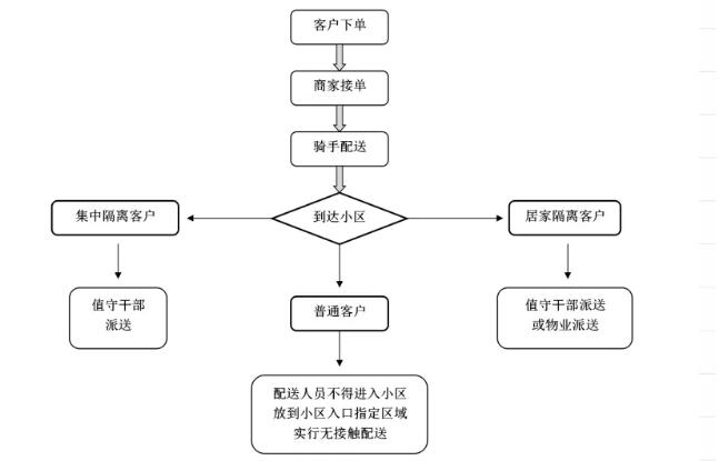 为提高配送效率,保障送餐安全,探索实行“餐饮+外卖+社区”的配送模式,充分利用社区值守干部、社区志愿者等组织脉络,逐步完善运行机制。普通居民可以通过线上下单,供餐企业接单后,由骑手配送至小区,放至指定区域,实行“无接触”配送。对于处于居家隔离或集中隔离的居民,由社区值守干部统一收集订餐需求,集中下单、统一配送。对于居家隔离客户,由社区值守干部或社区志愿者进行配送;对于集中隔离客户,由值守干部进行配送,在满足居民订餐需求的同时,切实保障送餐安全。