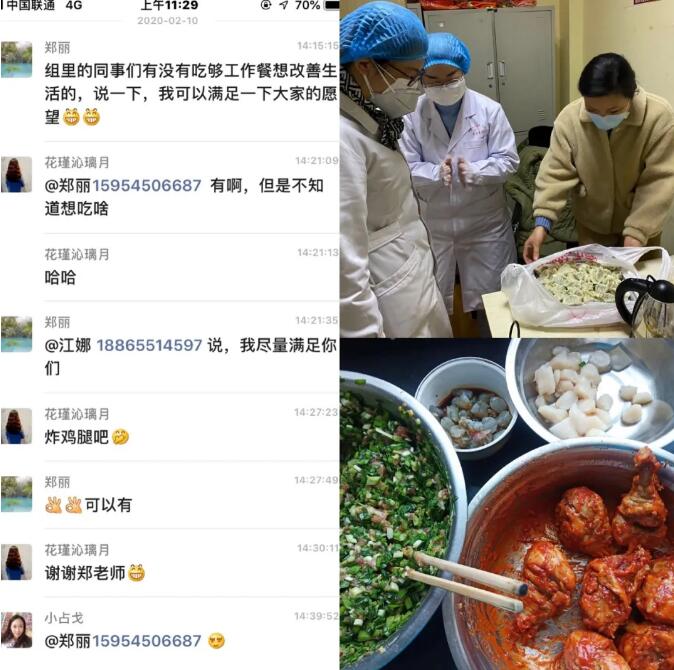 2月10日(农历正月十七),是郑丽进入隔离点以来第一次休息,与她并肩作战的伙伴们,大多是二十几岁的年轻人,在她眼里就是些孩子,看着这些孩子们元宵节都没能吃顿饺子,郑丽莫名的心酸。下班之后她顾不上休息,买来食材忙活了一个下午,准备了猪肉馅的水饺,还有伙伴们点名要吃的炸鸡腿和炸馒头干,让爱人开车,趁热给伙伴们送去了暖心的晚餐。