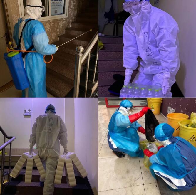 根据需求,隔离人员每天至少要配送四瓶水,每到送餐的时候,医护人员要身穿厚重的防护服、戴上密不透风的帽子、手套和防护眼镜,手提十几人份的饭盒和瓶装矿泉水,徒步走上三、四楼,女孩子提起走不了几步就要休息一下。他们把饭菜挨个送到房间,一圈下来整个人筋疲力尽、汗流浃背。为了节省防护装备,汗水一次又一次的浸透了衣衫,他们却不舍得换掉,衣服湿了干、干了又湿,就这样坚持了一整天。当他们敲开每一个房间的门,里面的人首先看到的是一张气喘吁吁、汗珠布满额头、防护镜里挂着水滴的脸……